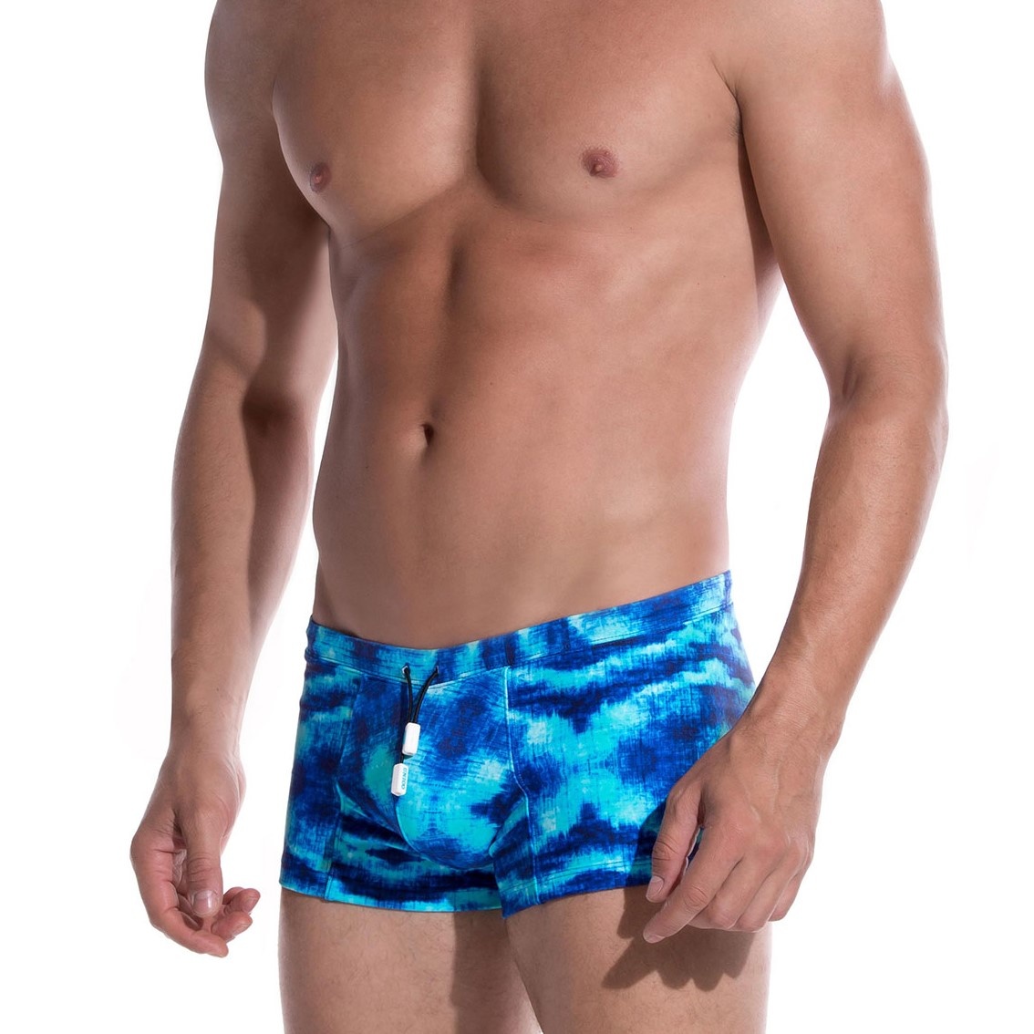 The Mundo Unico Shibori swimshort is a design swimshort in blue. These high quality swimshorts are made for you. The elastic drawstrings are black with a white part at the end. Shop your design swimshorts at Colomoda.